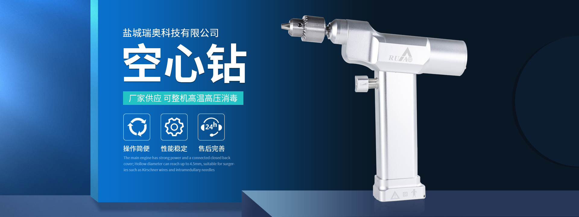 鹽城瑞奧科技有限公司主要產品:醫用電動鋸鉆系列(可高溫高壓消毒和熏蒸消毒兩種):包含骨鉆、擺鋸、胸骨鋸、空心骨鉆、開顱鉆、顱骨銑等等,適用于骨科、腦外科、神經外科、胸外科、手足及顯微外科、脊柱外科、整形外科等各種手術的要求。電動石膏鋸可切割高分子繃帶、石膏等。基礎器械系列:咬骨鉗,髓核鉗,椎板咬骨鉗,持骨鉗,四肢骨折手術器械包等。